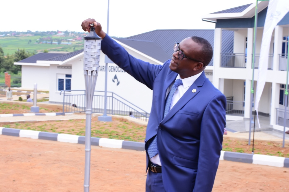 Minisitiri w’Ubumwe bw’Abanyarwanda n’Uburere Mboneragihugu, Dr. Jean Damascène Bizimana, acana urumuri rw’icyizere mu muhango wo gufungura urwibutso.
