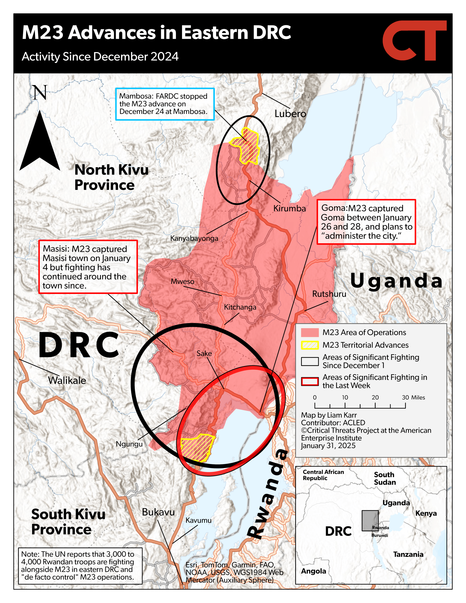 | Impamvu ya Amerika | Gukangurira u Rwanda kuva muri RDC kugira ngo habeho umutekano, ndetse no gukurura ishoramari rikomeye mu bucukuzi bw’amabuye y’agaciro muri aka karere . |